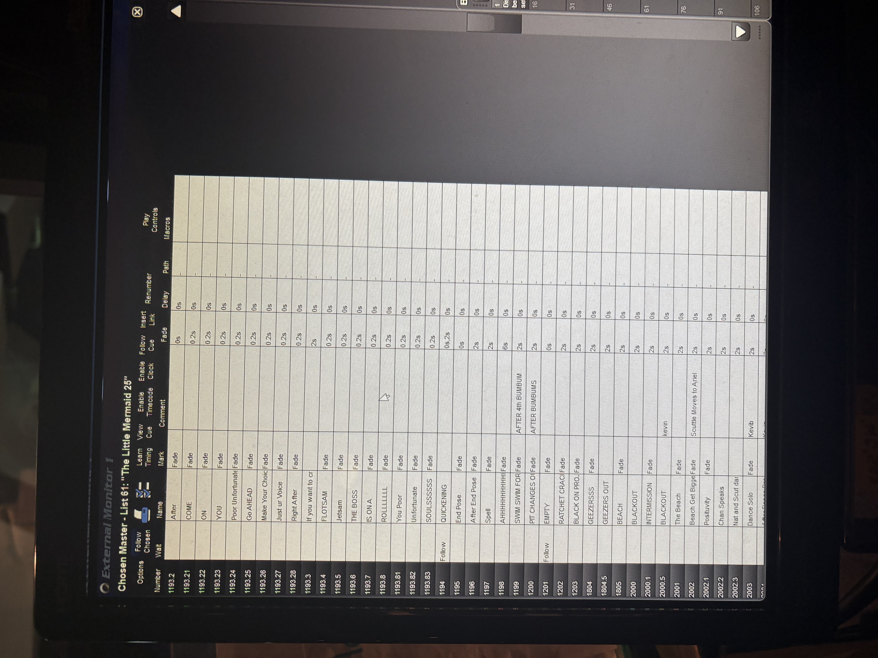 The Little Mermaid was diffidently one of my favorite shows from a technical perspective! I had so much fun learning to projection map complex walls and objects with our 5 projectors. Additionally from a lighting perspective this show was a welcomed challenge with having lots of projection cues in our light board and having a ton of wireless lights and fixtures in our moving set and props, for example we had wireless CoDots in our caldron and the shell. This was cool especially for the shell because we could have it pulse and change colors while somebody was holding it and when the shell breaks we can easily hide it. Adding all of these wireless fixtures required me to setup a new patching universe on our light board and link it to our Di-Fi transmitter(ADJ Protocol).